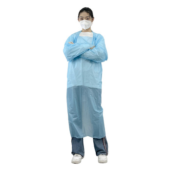 Yüksek kaliteli tek kullanımlık CPE elbisesi mavi anti-aerosol su geçirmez plastik önlük başparmak kanca koruyucu seviye 4 poli elbisesi